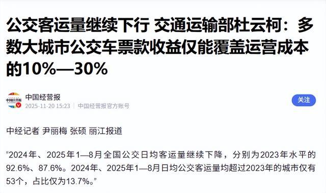 忙着搞副业,还不是因为主业赚不到钱。近几年,我国城市公交客运量一直在走下坡路。除了个别城市,多数大城市公交车的票款收益只能覆盖10%-30%的运营成本。说白了,就是卖票的钱连日常电费都不够,不琢磨点新路子根本活不下去。